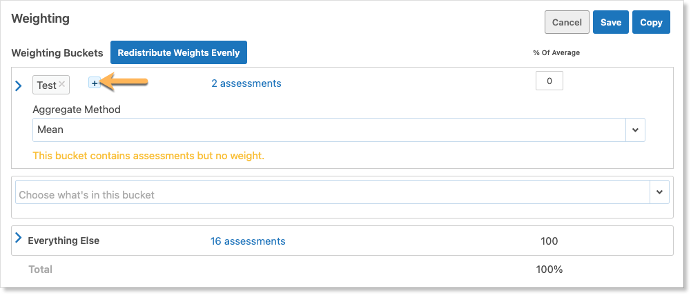 The teacher has created a set of buckets that account for 100% of the grade, but 12 assessments exist that don’t match any of the above buckets. The assessments are added to Everything Else and display a warning: “This bucket contains assessments but no weight”.