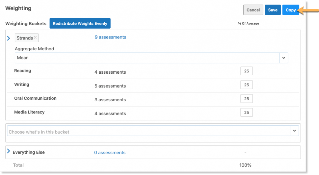 To add weighting for the strands, a new bucket must be added. Click the drop-down arrow to choose what the new bucket will contain. Select from the options under Strands.