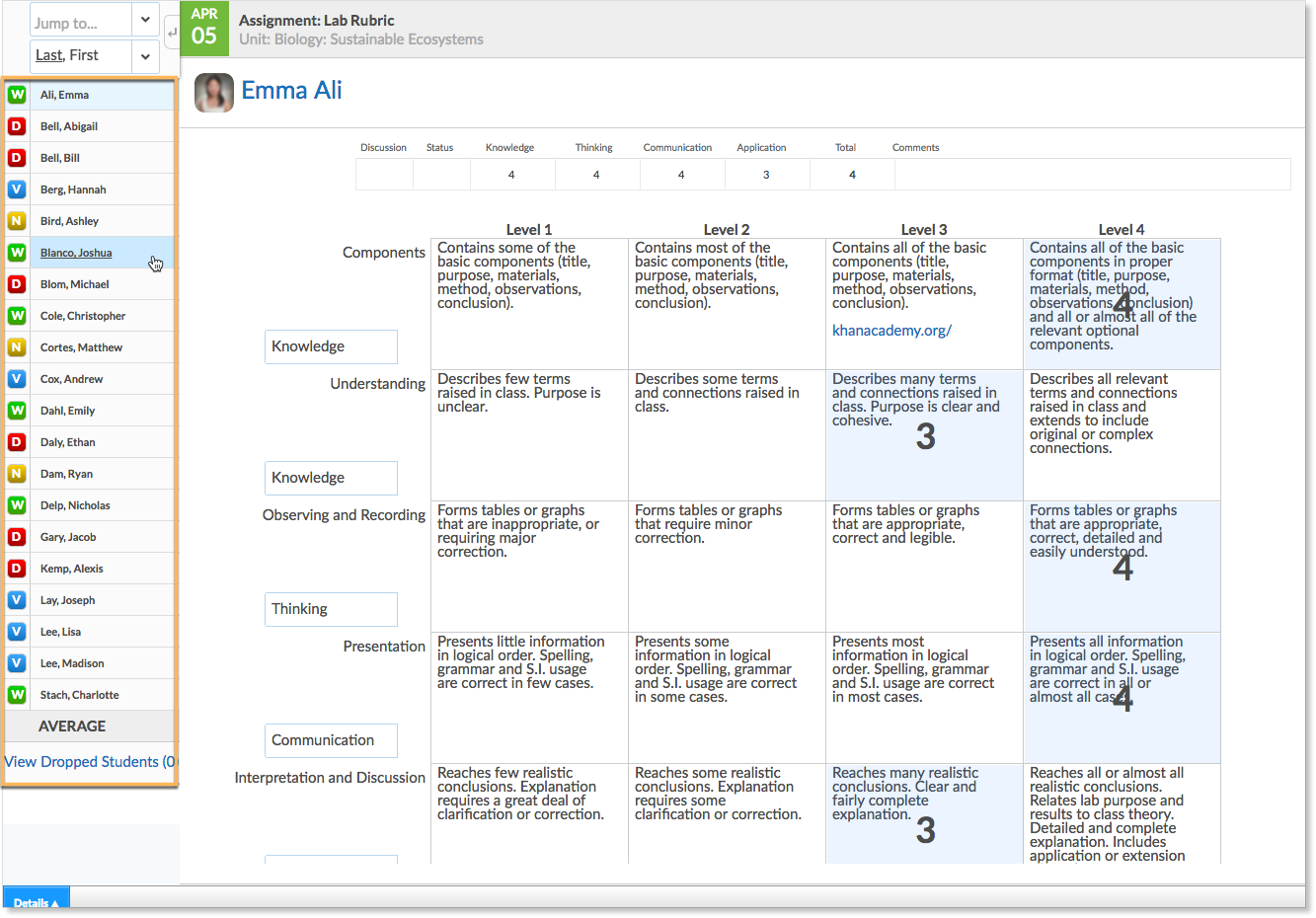 Students can also view the rubric of an assessment by clicking the name of an assessment, then clicking the name of the rubric in the lightbox.