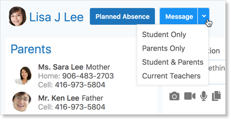 Teachers can communicate privately with the student and parents. Click the Message button to create a pre-addressed private message to just the student, just the parents, or to both student and parents. Recipients only see his or her own name in the To field.