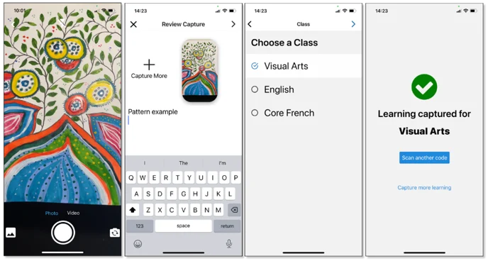 For example, a homeroom teacher can enable evidence submission in English, French, and Visual Arts and then provide each student with a single QR code. The code can be printed from either the English, French, or Visual Arts classes. The student scans the QR code, takes a photo or video, and then is presented with a list of valid classes. If only one class is enabled, no list is presented, the item is simply uploaded to the class.