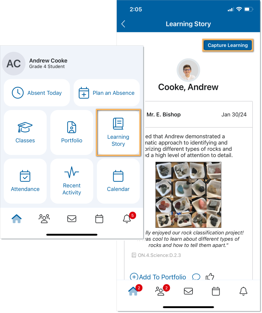 “I will be sharing student progress to their Learning Story. Navigate to your child’s Learning Story from the Home Screen on the Edsby mobile app.”