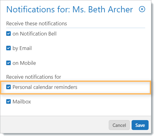 Teachers and students can be notified of reminders attached to events in their Personal Calendar.