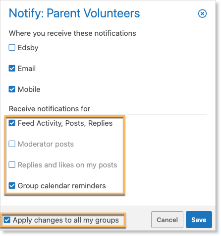Edsby can notify users of four different activities regarding their groups. Selecting Feed Activity, Posts, Replies will provide notifications regarding moderator posts as well as replies and likes on parents’ own posts, so these options are greyed.