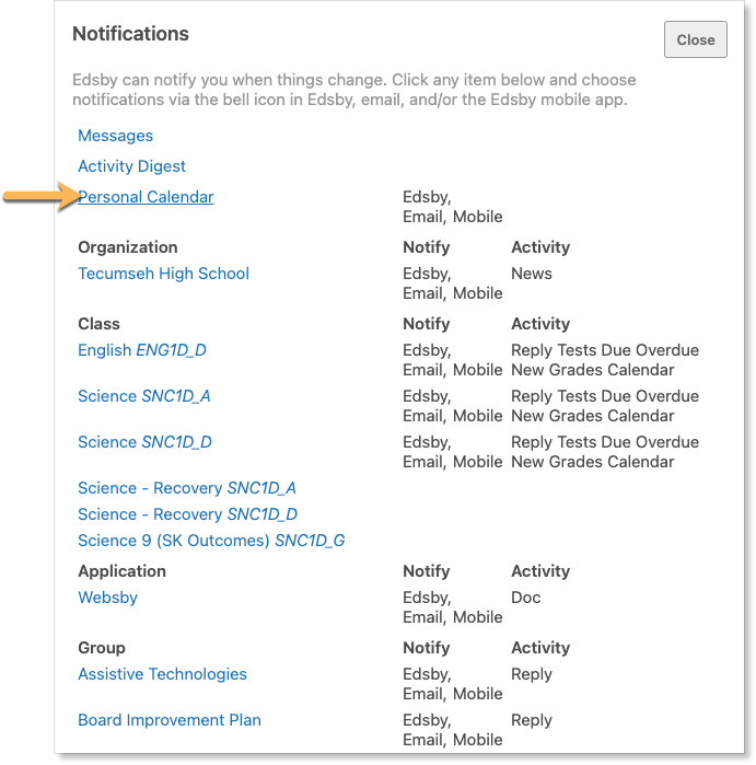 In this example, Beth Archer would like to receive Edsby and Mobile Notifications on her phone to remind her of events that she has entered into her Personal Calendar.