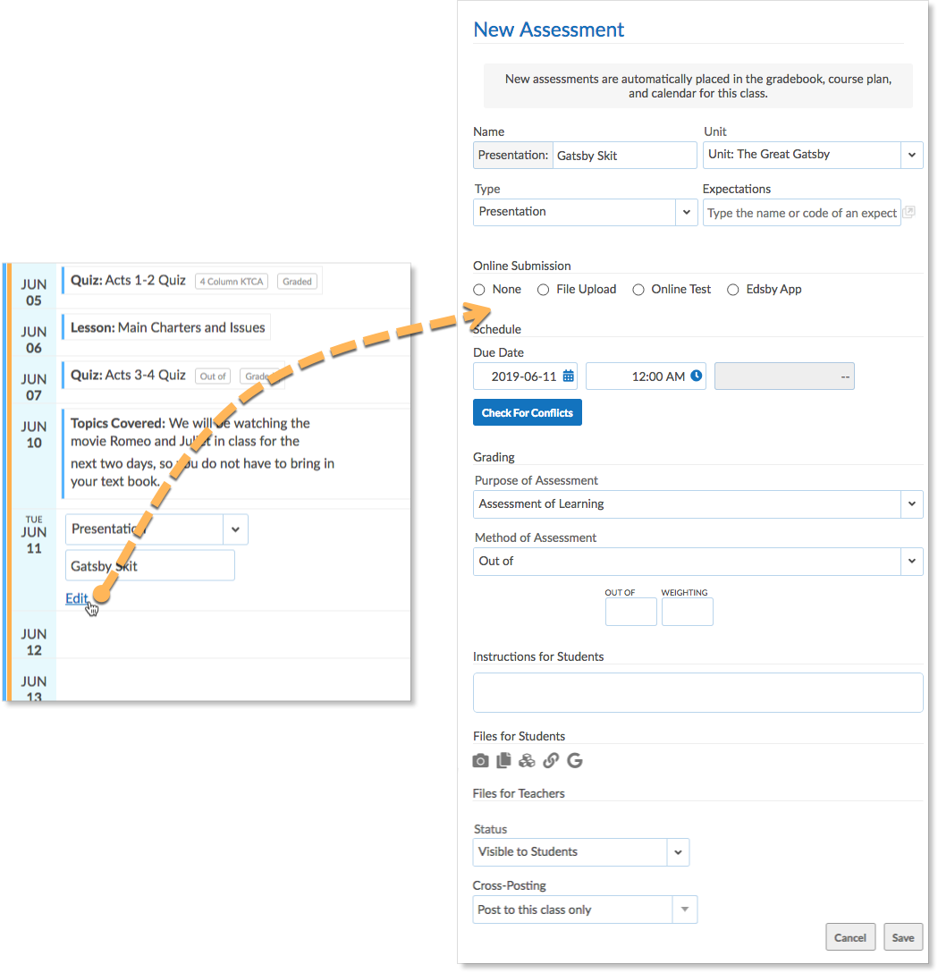 The Assessment will be added to the Planner, the Class feed, the Course Plan, Calendars, the Gradebook, and will be visible to the teacher as well as students and parents associated with the class if their visibility is enabled.