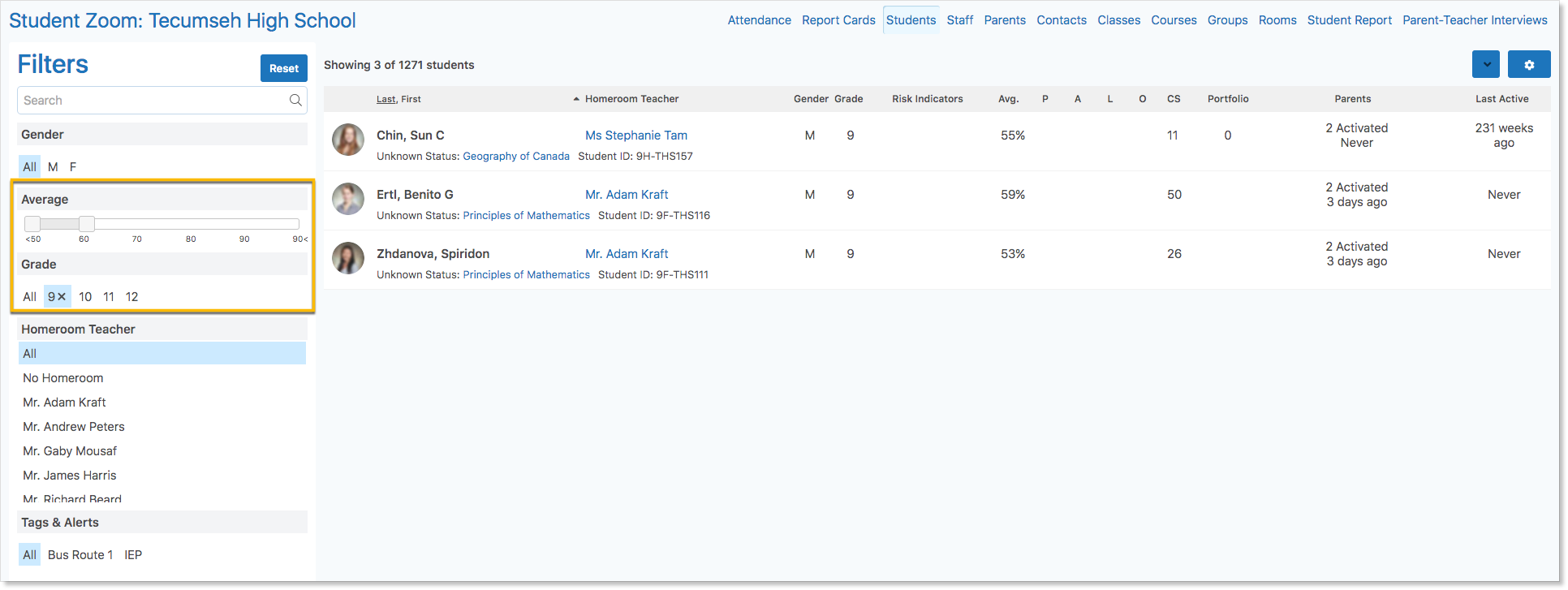 Use the filters and search in the Students Zoom to access the target students.